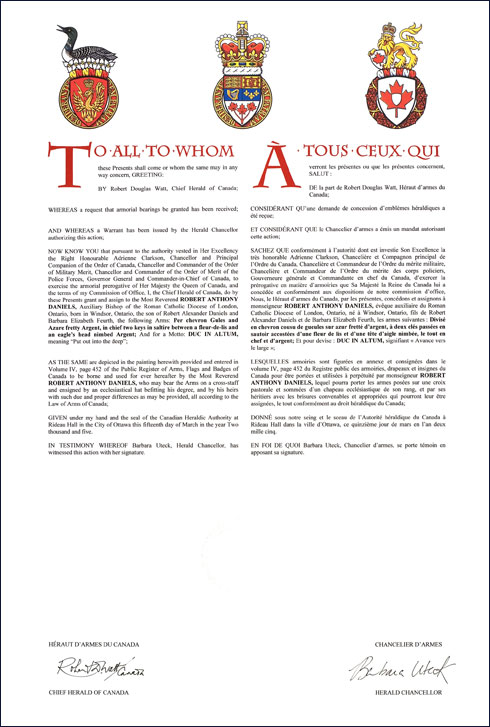 DeviseBlasonDUC IN ALTUM; SymbolismeSignifiant « Avance au large » dans la version de la Vulgate de la bible, cette sentence se trouve dans le verset 5,4 de l'évangile de Luc, où Jésus lui dit « Avancez en eau profonde, et lâchez vos filets pour la pêche. » L'évêque Daniels a choisi cette devise qui figure dans la lettre apostolique intitulée Novo Millennio Ineunte diffusée par le pape Jean-Paul II, le 6 janvier 2001, pour marquer le début du troisième millénaire. |