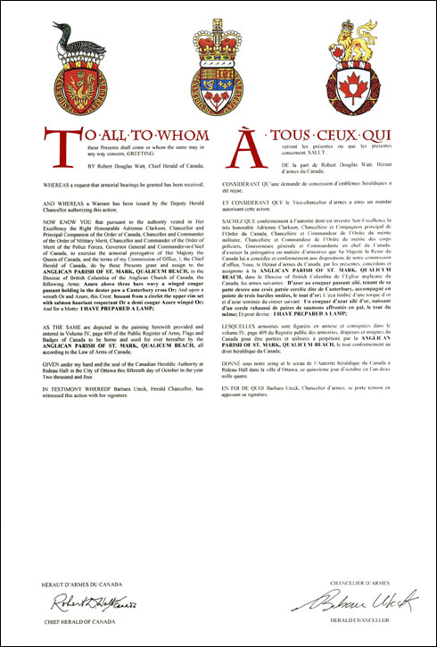 CimierBlasonUn couguar d'azur ailé d'or, naissant d'un cercle rehaussé de paires de saumons affrontés en pal, le tout du même; SymbolismeLe cercle de poissons renferme une triple signification. Il évoque le nom « Qualicum » dérivé du mot « Squal-li » signifiant « saumon kéta » en Pentlatch. Il rappelle aussi l’ancien symbole chrétien du poisson. Au nombre de quatre, les saumons renvoient également aux quatre Évangiles dont celui de saint Marc. Le couguar ailé reprend le symbolisme des armes. |