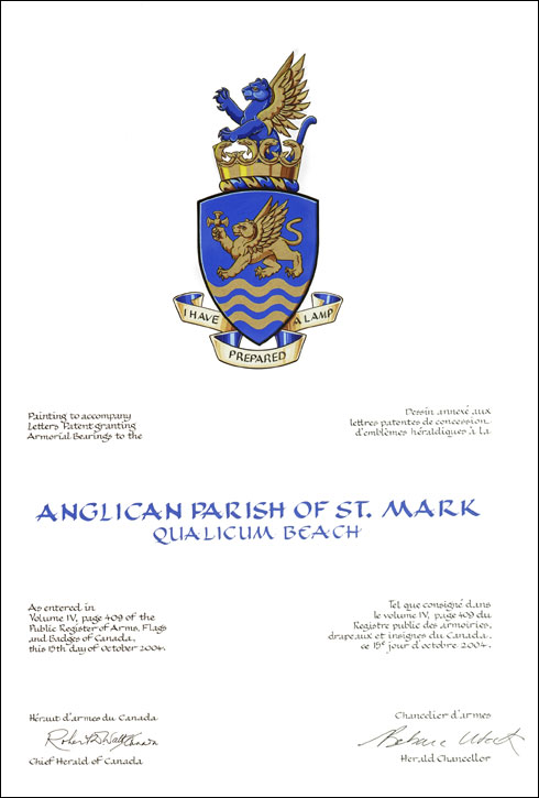 Armoiries de la Anglican Parish of St. MarkBlasonD'azur au couguar passant ailé, tenant de sa patte dextre une croix pattée cerclée dite de Canterbury, accompagné en pointe de trois burèles ondées, le tout d'or; SymbolismeLe bleu rappelle que l’église paroissiale est près de la mer. Le couguar ailé est une adaptation britanno-Colombienne du lion ailé traditionnel de saint Marc. La croix de Canterbury est associée à la communion anglicane et régulièrement arborée à St. Mark’s. Les rayures ondulées et dorées dans le bas de l’écu représentent le soleil reflété dans l’eau mouvante du littoral. Leur nombre, trois, évoque la Sainte Trinité et aussi les armes de la Colombie-Britannique où la paroisse est située. |