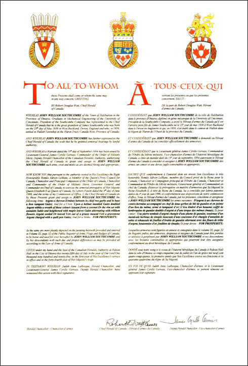 Armoiries de John William SouthcombeBlasonD'argent à un chevron de contre-hermine accompagné en chef de deux gerbes de blé de gueules et en pointe d'un lion du même, armé et lampassé d'or; SymbolismeLes éléments de cet écu s’inspirent des armes des Southcombe de Rose Ash, Devon, qui portent un chevron noir moucheté d’hermine blanche. Les gerbes de blé honorent les grands-parents de M. Southcombe, des homesteaders qui se sont établis au Manitoba et en Saskatchewan. Le lion représente ses ancêtres anglais et écossais. |