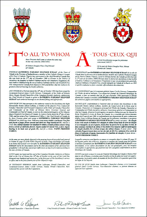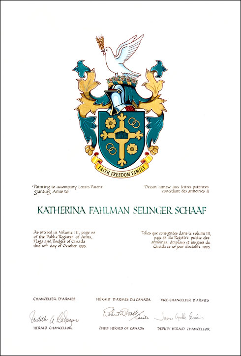 Armoiries de Katherina Fahlman Selinger SchaafBlasonDe sinople à une croix nouée et érablée d'or chargée en abîme d'une hutte de terre de sinople et accompagnée, aux un et quatre, d'une fleur de pavot d'or et, aux deux et trois, de deux anneaux entrelacés du même; SymbolismeLe champ vert évoque les armes de la Saskatchewan où les premiers Fahlman (parents de Mme Schaff) se sont établis en 1893. Cette couleur représente aussi la vie nouvelle, la croissance et le renouveau. L’or et la croix désignent la foi catholique des Fahlman. Les fleurons en feuille d’érable désignent le défi de se créer un avenir dans l’Ouest canadien. La hutte de terre symbolise la première habitation de Mme Schaff et la place centrale que la famille occupe toujours dans la vie des Fahlman. Le coquelicot représente la liberté et les anneaux d’or rendent hommage au couple fondateur et aux mariages des générations de Fahlman. |