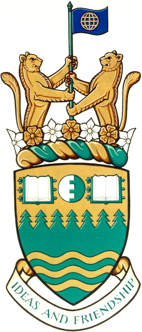 CimierBlasonDeux couguars affrontés d'or, naissants d'un cercle de roses d'or et de fleurs de cornouiller d'argent alternées, tenant ensemble une hampe de sinople d'où flotte à senestre une bannière d'azur à la figure du globe terrestre représentée par une sphère d'or marquée de latitudes et de longitudes du même; SymbolismeLe cercle composé de roses jaunes et de fleurs de cornouiller blanches établit un lien entre la résidence de M. Green au Texas et son travail en Colombie-Britannique. Les couguars, animaux indigènes de la province, symbolisent les hommes et les femmes de la communauté collégiale et accentuent la notion d’approche multidisciplinaire aux études et à la recherche. Le globe représente l’extension internationale qu’exige cette approche. |