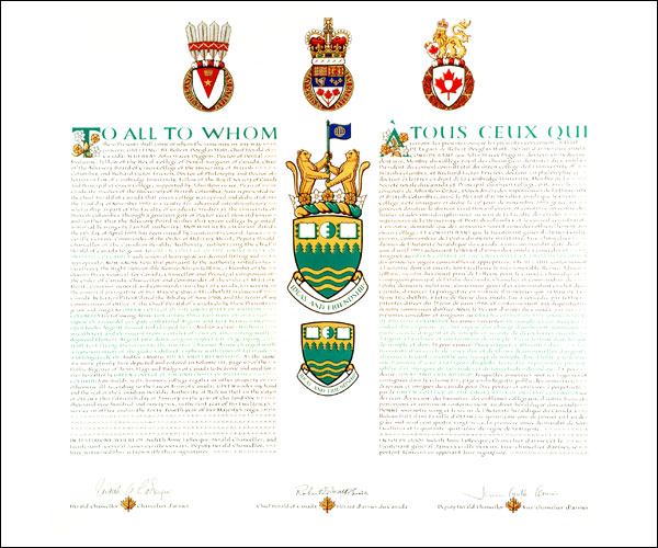 Informations additionnellesCréateur(s)Concept original de Robert D. Watt, héraut d'armes du Canada, assisté par les hérauts de l'Autorité héraldique du Canada Artiste-peintreJoan Bouwmeester CalligrapheJoan Bouwmeester Type de récipiendaireInstitution civile