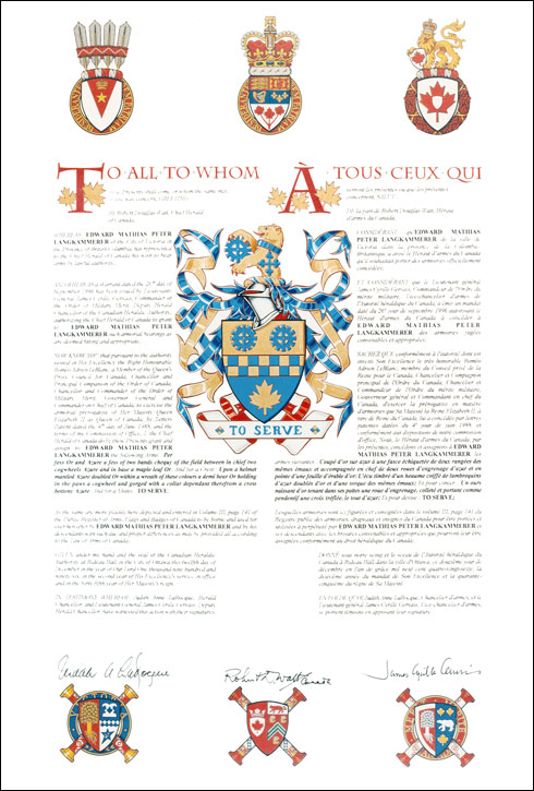 Armoiries d'Edward Mathias Peter LangkammererBlasonCoupé d'or sur azur à une fasce échiquetée à deux rangées des mêmes émaux et accompagnée en chef de deux roues d'engrenage d'azur et en pointe d'une feuille d'érable d'or; SymbolismeLa fasce à carreaux bleu et or provient des armes de Kreuznach, ville allemande d’origine des Langkammerer. La feuille d’érable honore le Canada, pays natal de M. Langkammerer. Les roues d’engrenage rappellent sa carrière de machiniste au chantier naval d’Esquimalt. |