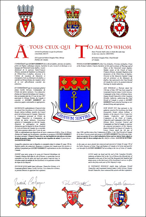 Informations additionnellesCréateur(s)Concept original de Lucien Godbout, assisté par les hérauts de l'Autorité héraldique du Canada. Artiste-peintreRobert Létourneau CalligrapheSans objet Type de récipiendaireIndividuel |