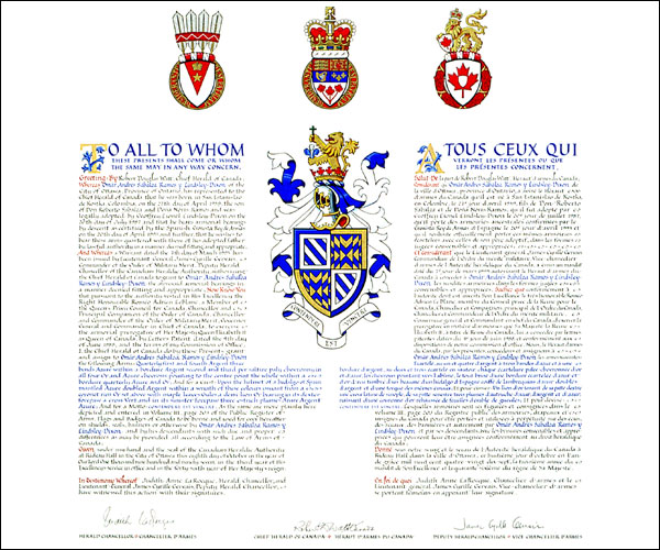 Informations additionnellesCréateur(s)Concept original de Robert D. Watt, héraut d’armes du Canada, assisté par les hérauts de l'Autorité héraldique du Canada. Artiste-peintreRobert Létourneau CalligrapheNancy Ellis Type de récipiendaireIndividuel |