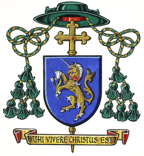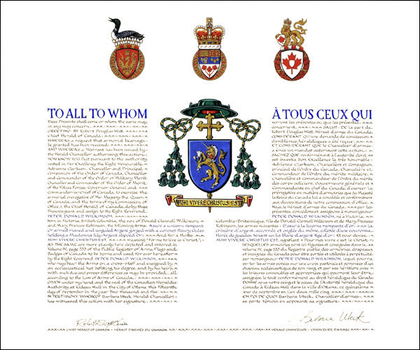 Armoiries de Peter Donald WilkinsonBlasonD’azur à la licorne rampante d’or, la crinière d’argent, accornée et onglée du même, colletée d’une couronne florée de gueules, tenant un lis blanc d’argent tigé d’or; SymbolismeLa licorne est reprise des armoiries traditionnellement associées au nom Wilkinson. C’est également un symbole associé au Christ. Ici, elle tient un lis, symbole de la Vierge Marie, et porte autour du cou une couronne en forme de fleurs de lis, qui renforce la symbolique mariale. |