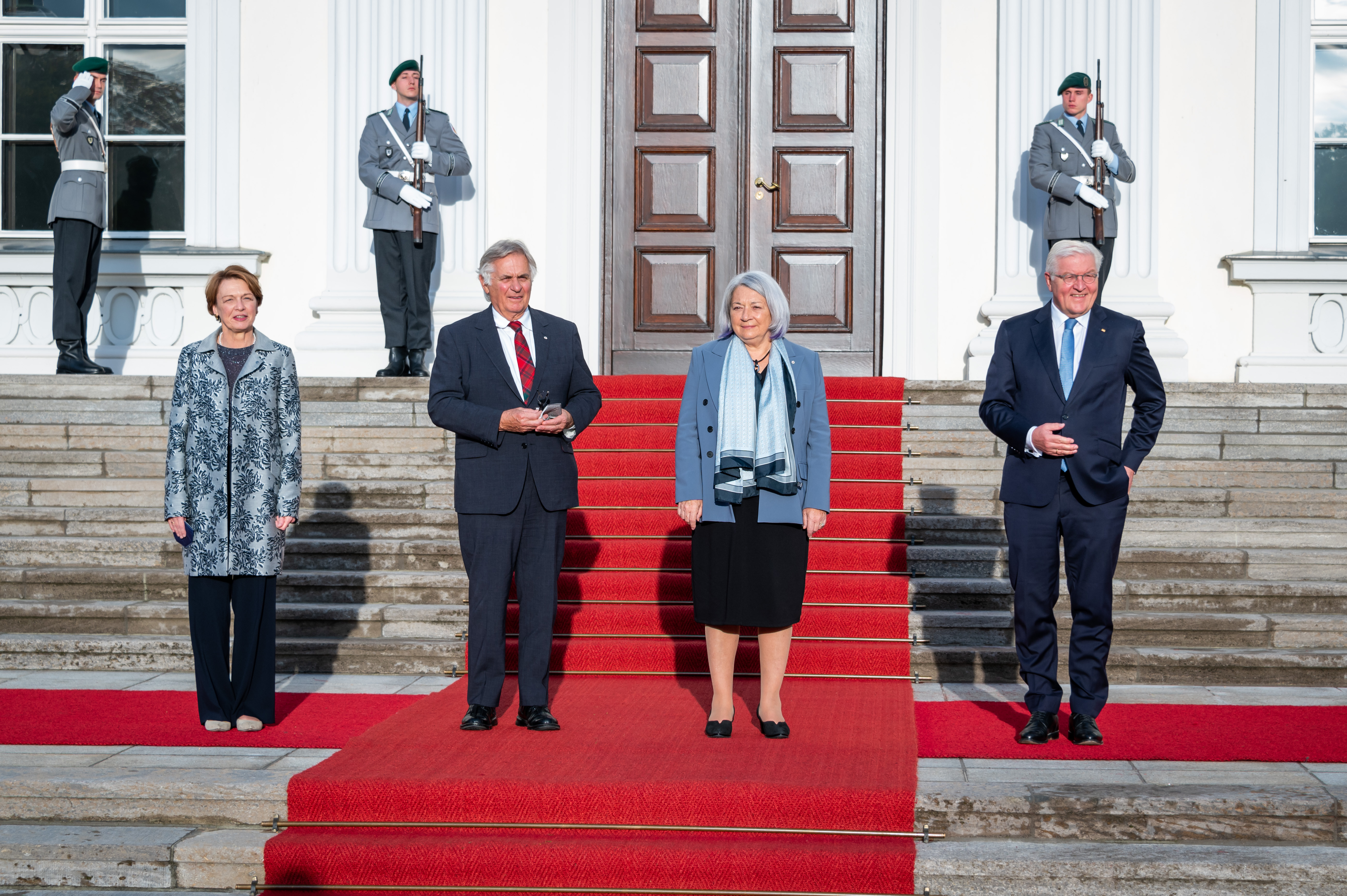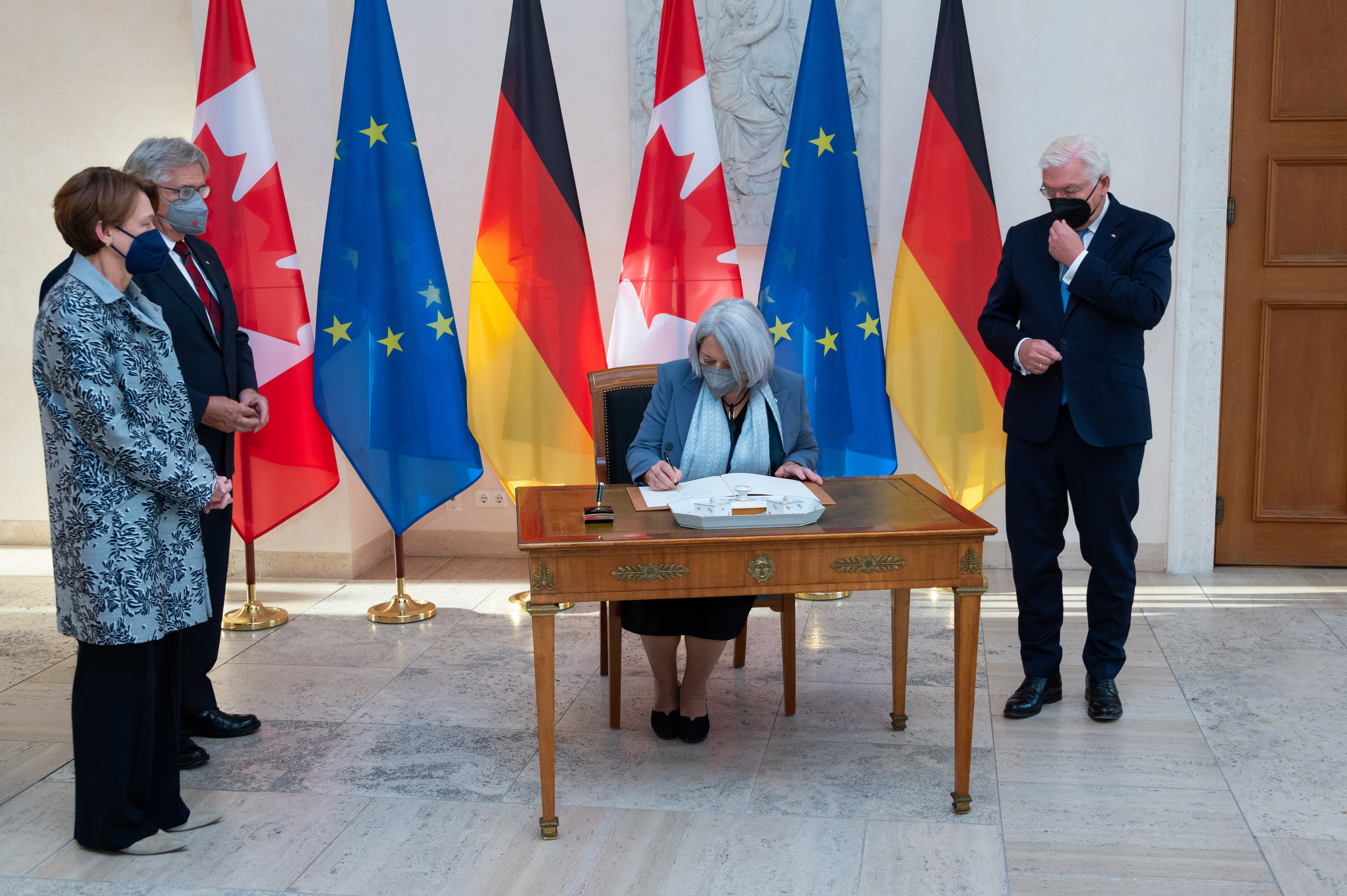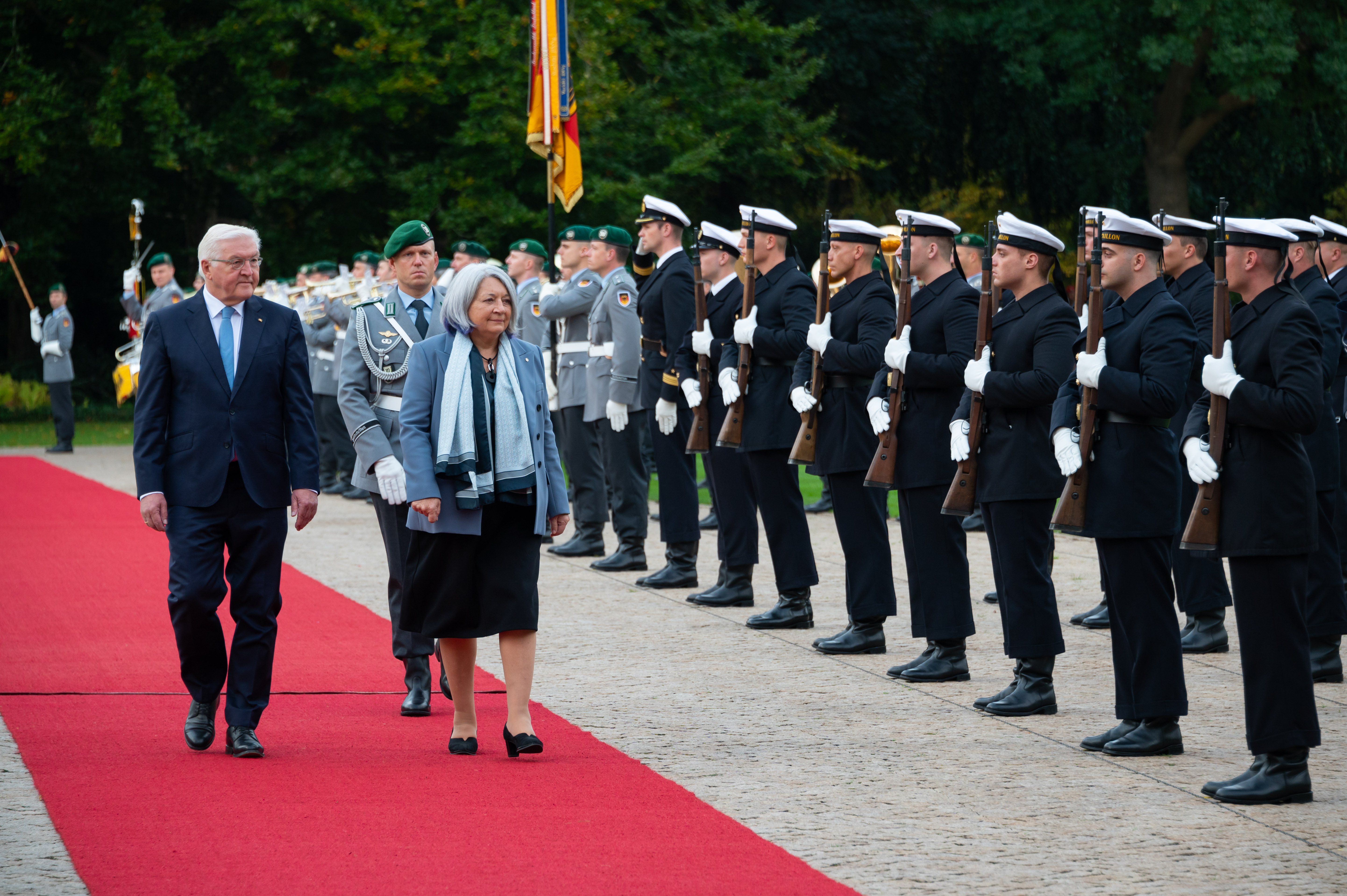 In the morning, the Governor General met with His Excellency Frank-Walter Steinmeier, President of the Federal Republic of Germany. Upon arrival, Their Excellencies signed the guest book and were greeted with a welcome ceremony.