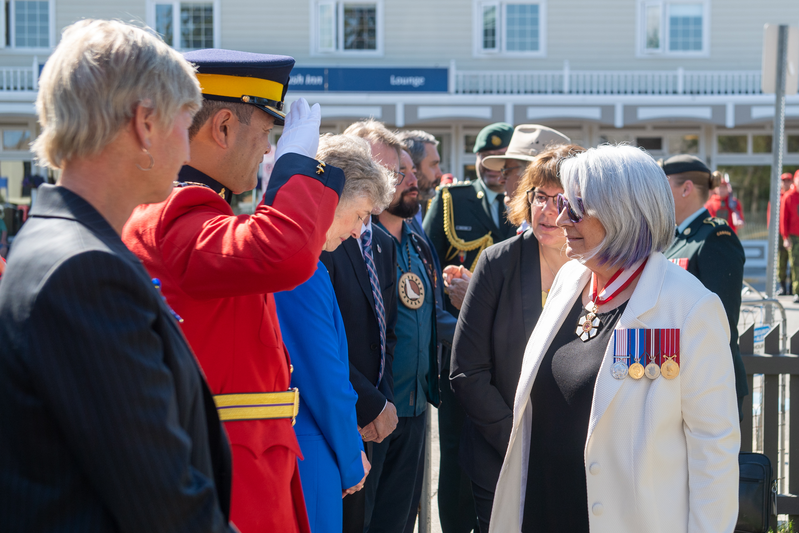 Their Excellencies arrived at Taylor House, the official office of the Commissioner of Yukon, and were greeted by the Honourable Angélique Bernard, Commissioner of Yukon. Her Excellency also inspected a guard of honour.