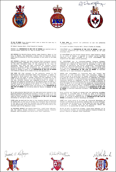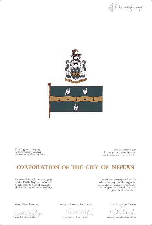 Additional InformationCreator(s)Original concept of the Corporation of the City of Nepean, assisted by the heralds of the Canadian Heraldic Authority. PainterDavid Farrar CalligrapherJudith Bainbridge Recipient TypeCivil Institution