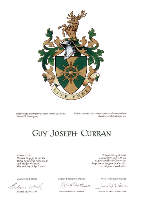 Arms of Guy Joseph CurranBlazonVert a cross patté throughout, overall a ship's wheel Or; SymbolismThe colours, green and gold, celebrate Mr. Curran’s Irish ancestry. The cross refers to his Roman Catholic faith, and the ship’s wheel alludes to his involvement with and affection for power boating. |