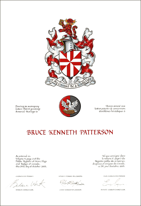Badge of Bruce Kenneth PattersonBlazonOn a roundel per pale Gules and Sable a pelican in its piety Argent beaked and nested Or; SymbolismRed and black are the colours of Trinity College, Toronto, Mr. Patterson’s alma mater. The heraldic pelican is a Christian symbol of sacrifice often used by Patterson armigers. |