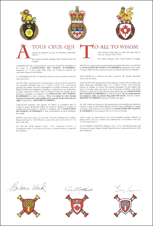 Additional InformationCreator(s)Original concept of Louise Martel and Jean-Marie Martel, assisted by the Heralds of the Canadian Heraldic Authority PainterDebra MacGarvie CalligrapherNancy Ellis Recipient TypeCivil Institution