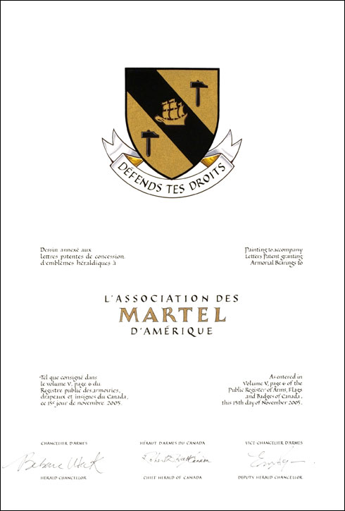 MottoBlazonDÉFENDS TES DROITS; SymbolismMeaning “Defend your rights”, this phrase recalls the arduous battle waged by the ancestors of the Martels to protect their lands and the few goods they had on their arrival in North America. |