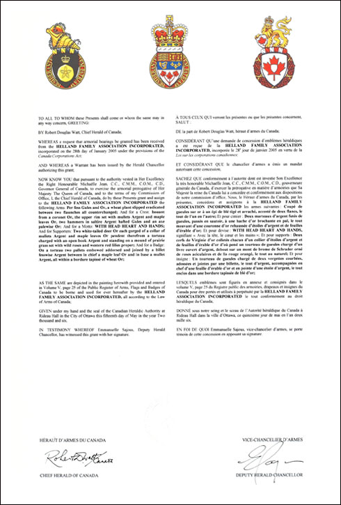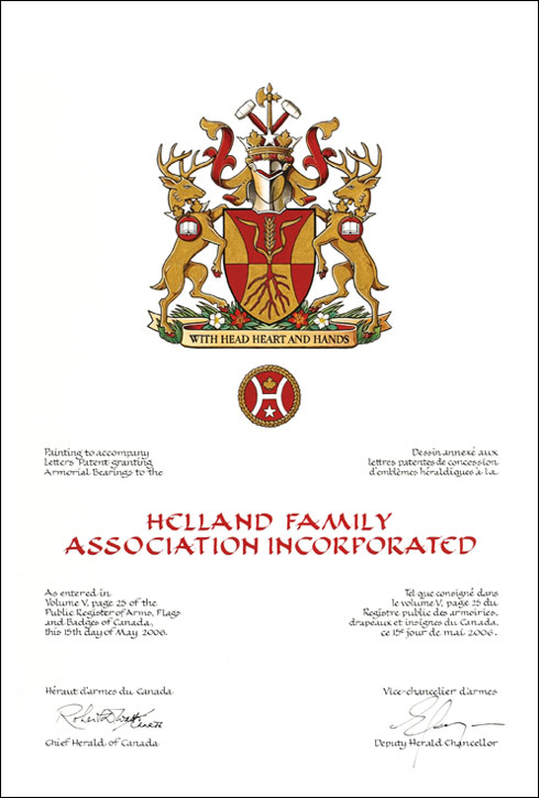 Arms of the Helland Family Association IncorporatedBlazonPer fess Gules and Or, a wheat plant slipped eradicated between two flaunches all counterchanged; SymbolismThe central image of the wheat represents the prairie home of the Helland family, who settled in North Dakota and then in Saskatchewan after emigrating from Norway. By showing the roots of the plant, which allude to the importance of heritage and also resemble a family pedigree, the role of the Association in researching the family’s genealogy is emphasized. The “flaunches” on either side create a stylized “H” with the horizontal division; they can also symbolize the “New World” and the “Old World” and thus to the emigration of Kristoffer Oleson Helland from Norway. Red and gold are the colours of the municipality of Vestnes in Norway, in which the village of Helland is located. |
