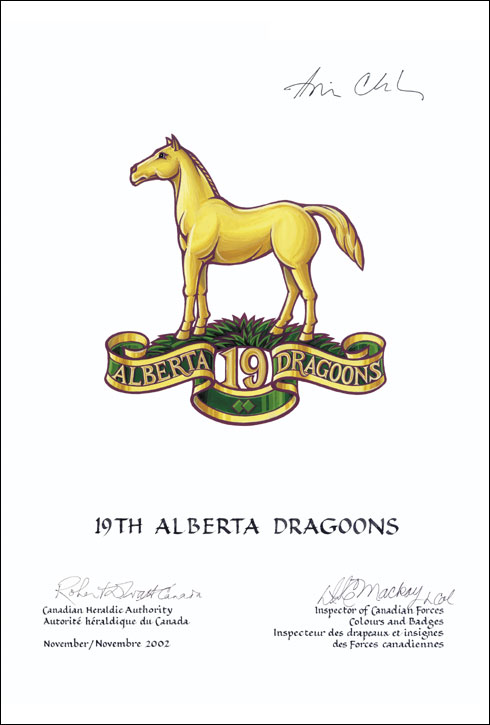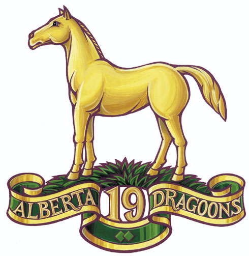 Badge of the 19th Alberta DragoonsBlazonA horse statant Or on a grassy mound Vert above the numeral 19 Or all on a scroll Vert edged and inscribed ALBERTA DRAGOONS in letters Or; SymbolismThe horse represents the unit's origins as a mounted rifle regiment. The mound on which it stands symbolizing the prairie setting of the unit's home base of Edmonton. "ALBERTA DRAGOONS" and the number "19" are a form of the regimental title. |
