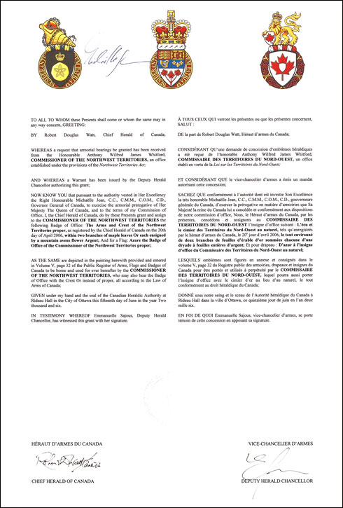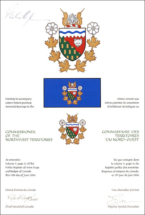 Additional InformationCreator(s)Original concept of the Badge by Daniel L. Norris, and of the Flag by Darrel Kennedy, Assiniboine Herald, assisted by the Heralds of the Canadian Heraldic Authority. PainterDebra MacGarvie CalligrapherShirley Mangione Recipient TypeCivil Institution