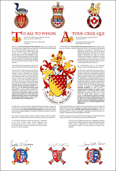 CrestBlazonA demi lion crowned with a St. John coronet Or capped Gules gorged of a collar also Gules dependant therefrom a trefoil Vert and holding in the dexter paw a flame proper; SymbolismThe lion is taken from arms borne by Irish armigers named Holmes. The shamrock honours Mr. Harding’s Irish heritage. The flames emanating from the lion’s paw refer to Mr. Harding’s firefighting career. The coronet of Maltese crosses pays tribute to Mr. Harding’s work with the Most Venerable Order of the Hospital of St. John of Jerusalem and the St. John Ambulance. |