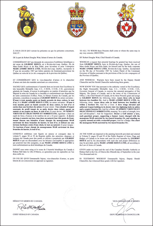 Arms of Gilbert RiouxBlazonAzure three orbs in bend between two bendlets Or; SymbolismHistorically, orbs symbolize temporal power. Here, they represent part of the motto of Marc-André Rioux Ltée, a business founded by Mr. Rioux’s father. They are also a reference to New France and to Seigneur Jean Riou, the family’s earliest ancestor in Canada. |