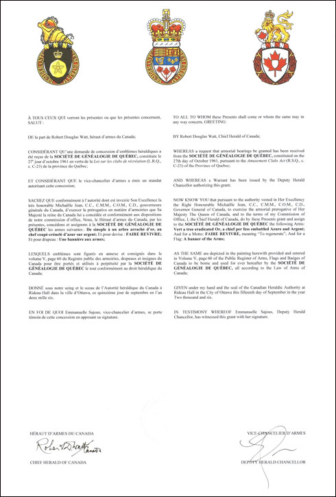 Additional InformationCreator(s)Original concept of the Société de généalogie de Québec, assisted by the Heralds of the Canadian Heraldic Authority. PainterD. Robert Tunstall CalligrapherDoris Wionzek Recipient TypeCivil Institution