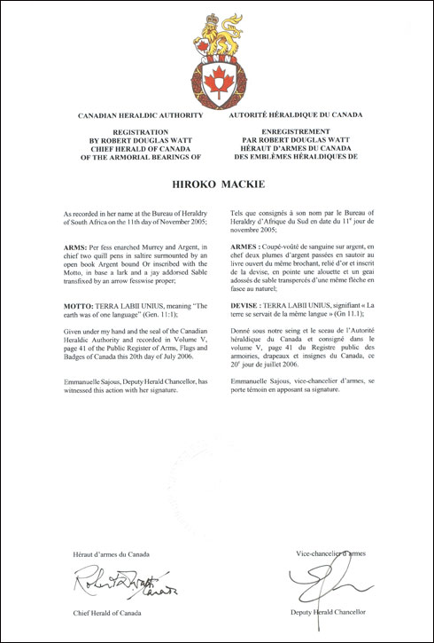 Arms of Hiroko MackieBlazonPer fess enarched Murrey and Argent, in chief two quill pens in saltire surmounted by an open book Argent bound Or inscribed with the Motto, in base a lark and a jay addorsed Sable transfixed by an arrow fesswise proper; SymbolismThe deep red and white colours are those found on the flag of Kumamoto Prefecture in Japan, where Ms. Mackie was born and raised. The Scottish arms of Mackie of Larg feature two ravens pierced by a single arrow: here the ravens are changed to a jay, representing the Steller’s jay, the avian symbol of British Columbia, the home province of Ms. Mackie’s husband; and to a lark, representing a Eurasian skylark, the avian symbol of Kumamoto Prefecture. The arrow piercing the birds’ hearts alludes to the romantic union of Ms. Mackie and her husband. The book and quills signify Ms. Mackie’s scholarly achievements in Japan and Canada and her love of reading and calligraphy. The pens form an X, alluding to the name of St. Francis Xavier, the patron saint of Japan. |