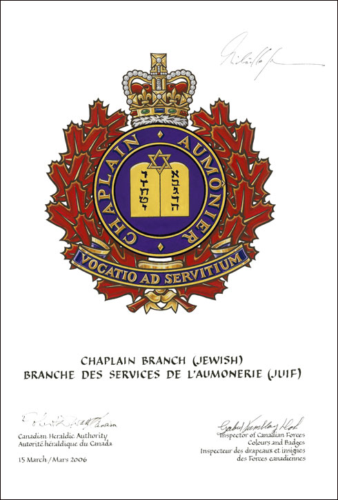Badge for the Jewish chaplains of the Chaplain BranchBlazonFor the Jewish chaplains: Purpure the tablets of the Law ensigned by a Magen David Or within an annulus Purpure fimbriated and inscribed CHAPLAIN • AUMÔNIER in letters Or; SymbolismFor the Jewish chaplains: Purple and gold have been chosen as colours distinctive to the clergy. The red maple leaves refer to service to veterans and the fallen. The Royal Crown symbolizes service to the Sovereign as Queen of Canada. The tablets of the Law and the Magen David are symbols central to the Jewish faith. |