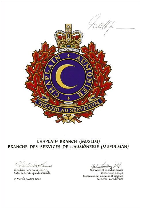 Badge for the Muslim chaplains of the Chaplain BranchBlazonFor the Muslim chaplains: Purpure a decrescent Or within an annulus Purpure fimbriated and inscribed CHAPLAIN • AUMÔNIER in letters Or; SymbolismFor the Muslim chaplains: Purple and gold have been chosen as colours distinctive to the clergy. The red maple leaves refer to service to veterans and the fallen. The Royal Crown symbolizes service to the Sovereign as Queen of Canada. The crescent is the pre-eminent symbol of Islam and has been such for centuries. |
