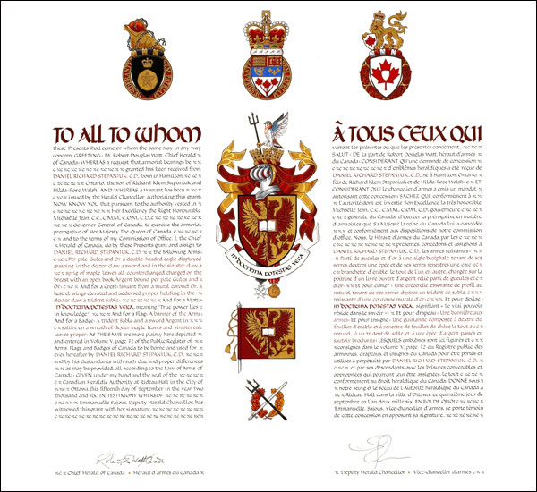 Additional InformationCreator(s)Original concept of Daniel Stepaniuk, assisted by the heralds of the Canadian Heraldic Authority. PainterDebra MacGarvie CalligrapherShirley Mangione Recipient TypeIndividual |