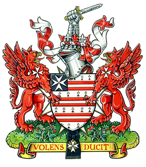 SupportersBlazonOn either side a griffin Gules armed and beaked Or charged on the breast with a Maltese cross Argent and standing upon a grassy mound growing thereon strawberry plants flowered and fructed proper; SymbolismThe griffin joins the majesty of the lion, king of beasts, and the eagle, king of the air, underlining the strength and vigilance of both. The strawberries are another canting reference to the name Barry, and the Maltese crosses refer to the Order of St. John. |