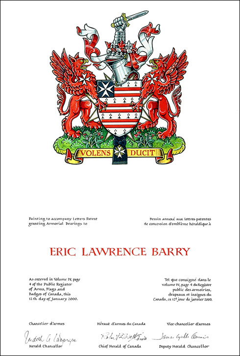 Arms of Eric Lawrence BarryBlazonErmine three bars gemmel Gules a canton Sable charged with a Maltese cross Argent; SymbolismThe parallel bars are a pun on the Barry name. The ermine is used in the arms for Lawrence and thus honours Mr. Barry’s mother, née Lawrence. The Maltese cross denotes Mr. Barry’s involvement in the Order of St. John. |