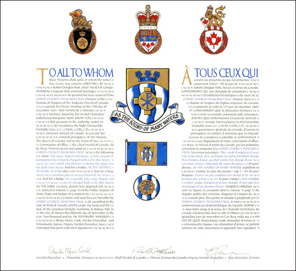 Arms of Christ ChurchBlazonPaly wavy Argent and Azure, a cross couped Or surmounted by a bezant charged with a Chi-Rho Azure, on a chief enarched Or a coronet the upper rim set with roses Azure; SymbolismThe sacred monogram of Christ is an indication of the parish’s name. The cross and disc shape is similar to that of the badge of the Anglican Church of Canada. The background of wavy stripes is indicative of the nearby Niagara Falls. The top section alludes not only to the shape of Horseshoe Falls, but also to the nearby Rainbow Bridge spanning the Niagara River. The idea of a bridge also refers to the Church’s mission in the world. The coronet of roses refers to one of the main crops of the Niagara region, and to the visit the then Princess Elizabeth made to the church in 1951 (as Princess Elizabeth, her coat of arms included a rose). |