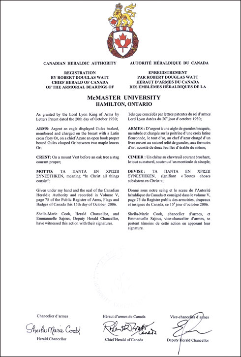 Arms of McMaster UniversityBlazonArgent an eagle displayed Gules beaked, membered and charged on the breast with a Latin cross flory Or, on a chief Azure an open book proper bound Gules clasped Or between two maple leaves Or; SymbolismThe eagle, with its remarkable powers of sight, symbolizes the university’s guiding principles based on religious morality, a “heavenly vision” of Christian inspiration, also represented by the cross. The book signifies learning. The maple leaves represent the province of Ontario, where the university is located, and whose provincial government granted the University’s charter. |
