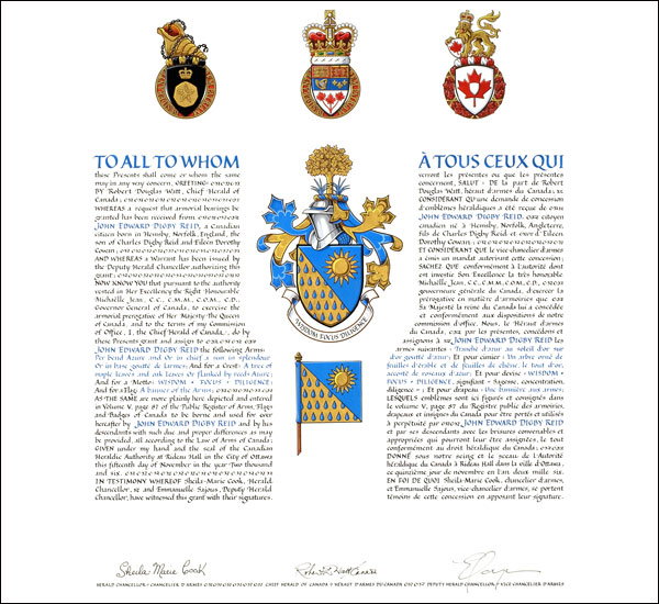 Additional InformationCreator(s)Original concept of Robert D. Watt, Chief Herald of Canada, assisted by the heralds of the Canadian Heraldic Authority. PainterRobert Grey CalligrapherNancy Ellis Recipient TypeIndividual |