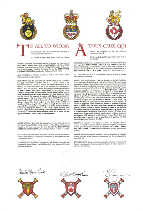 Grant of Arms, Supporters, Flag and Badge, for use by Brentwood College School