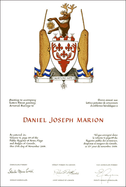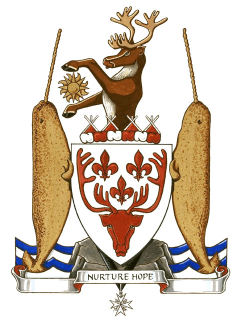 SupportersBlazonTwo narwhals Or rising from barry crested Azure and Argent on either side of a rock proper; SymbolismThe narwhals allude to the crest of the Northwest Territories, of which Mr. Marion was the 13th Commissioner from 1999 to 2000. |
