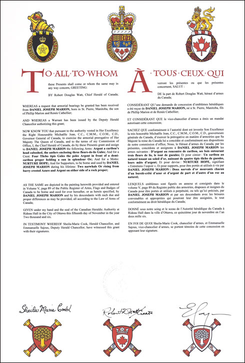 Arms of Daniel Joseph MarionBlazonArgent a caribou’s head caboshed, the antlers enclosing three fleurs-de-lis Gules; SymbolismThe fleurs-de-lis design is based on the arms adopted by the Marion family. The caribou is an animal of importance in the Northwest Territories. |