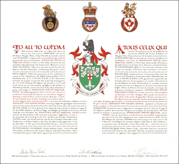 Additional InformationCreator(s)Original concept of Jonathan Good, assisted by the heralds of the Canadian Heraldic Authority. PainterD. Robert Tunstall CalligrapherLuc Saucier Recipient TypeIndividual |