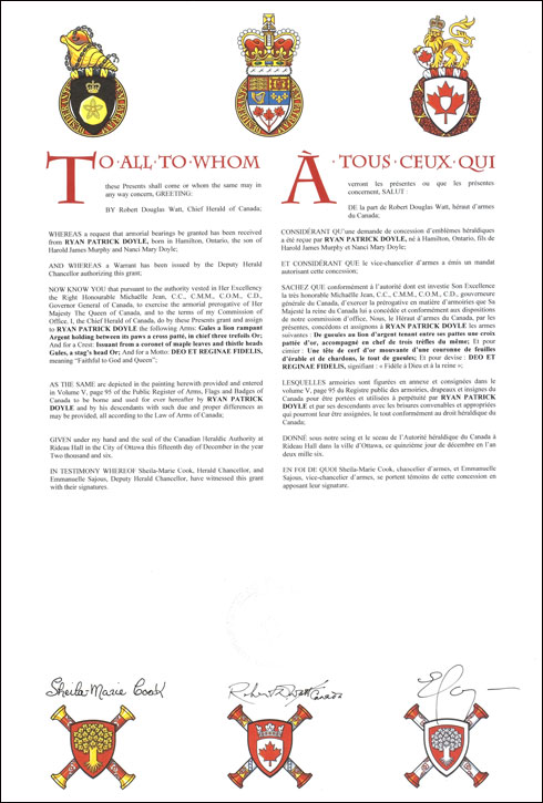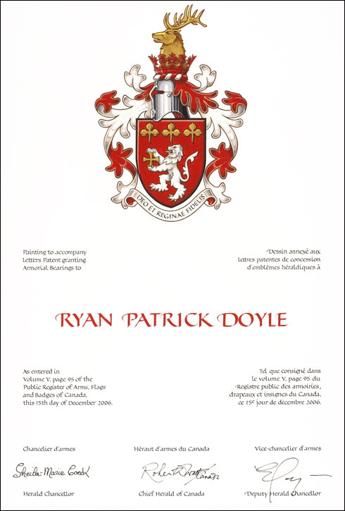 Arms of Ryan Patrick DoyleBlazonGules a lion rampant Argent holding between its paws a cross patté, in chief three trefoils Or; SymbolismThe Arms are based on those associated with Murphy, Mr. Doyle’s father’s name. Red and white are also the colours of Canada. The cross is in the style used in the Royal Crown and indicates Mr. Doyle’s support of the Crown and justice in Canada. The three trefoils allude to the Irish heritage of the families of Doyle, Murphy and Ross. |