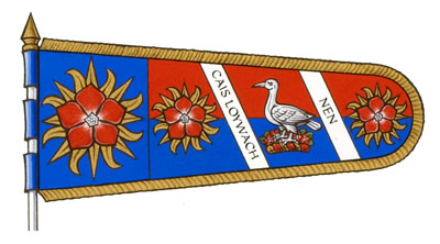 Flag of Keith William JamesBlazonA standard, the Arms in hoist, the fly per fess Gules and Azure charged with the Crest between two representations of the Badge all separated by two bends Argent inscribed with the Motto; SymbolismThe symbolism of this emblem is found in other element(s) of this record. |