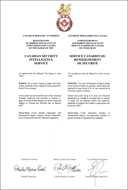 Badge of the Canadian Security Intelligence ServiceBlazonOn a square Argent a maple leaf Gules within a palisade Azure edged Or and insigned by the Royal Crown proper; SymbolismBlue and gold are the colours of the Royal Canadian Mounted Police, which was responsible for national security intelligence prior to July 16, 1984, when the Service began operations. The palisade symbolizes the defensive role of the agency against threats to national security. The Royal Crown represents the protection of the peace on behalf of the Sovereign. |