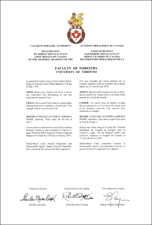 Arms of the Faculty of Forestry, University of TorontoBlazonBarry wavy Argent and Azure a spruce tree eradicated Vert dimidiating an oak tree eradicated Or fructed Vert; SymbolismNot applicable |