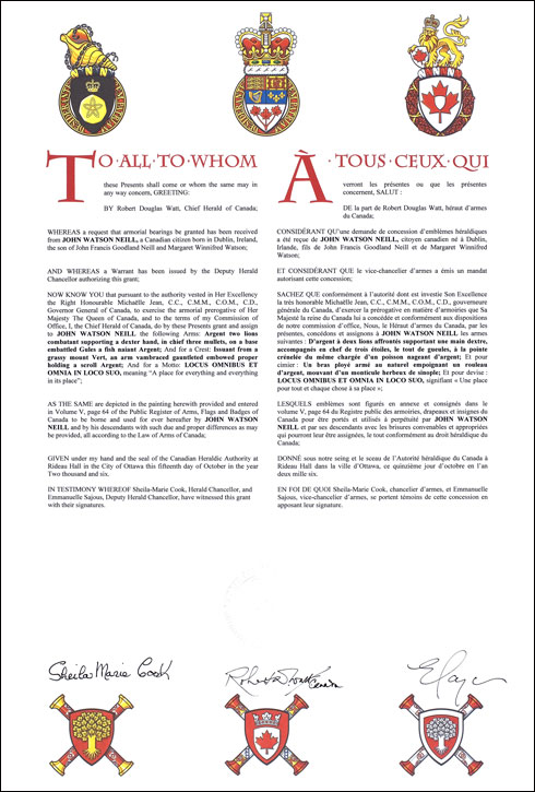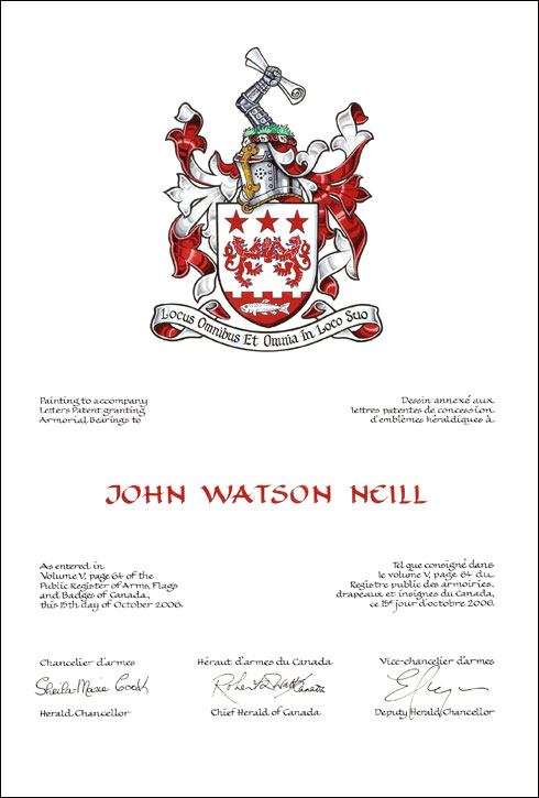 MottoBlazonLOCUS OMNIBUS ET OMNIA IN LOCO SUO; SymbolismThis means “A place for everything and everything in its place” and refers to the principle of land use zoning as a further reference to Mr. Neill’s career in urban planning. |