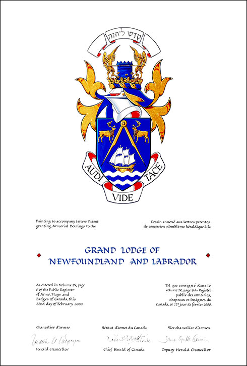 CrestBlazonIssuant from a circlet of pitcher plants Or the Ark of the Covenant Azure handles Or supported by two seraphim also Or; SymbolismThe Ark of the Covenant with its cherub supporters is traditionally used as a crest by Masonic Grand Lodges. Here it appears in the colours of the arms within a wreath of pitcher plants, the provincial flower of Newfoundland and Labrador. |