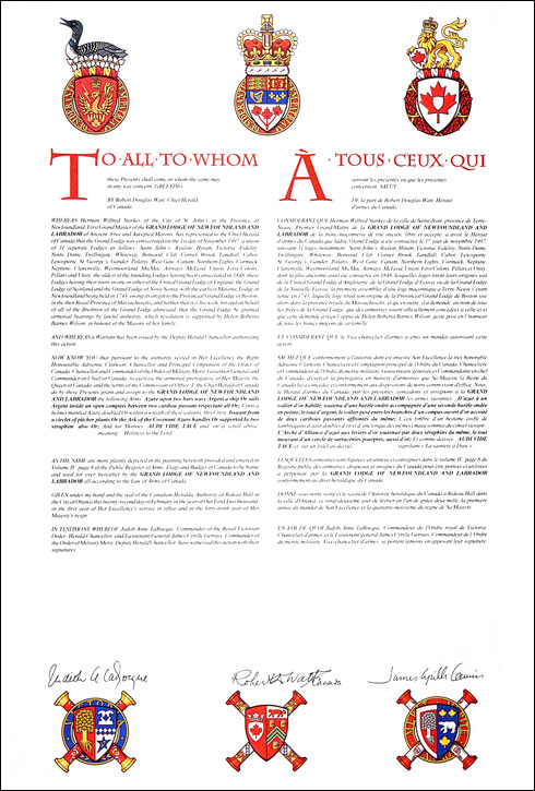 Additional InformationCreator(s)Original concept of Robert D. Watt, Chief Herald of Canada, assisted by the heralds of the Canadian Heraldic Authority. PainterLinda Nicholson CalligrapherJudith Bainbridge Recipient TypeCivil Institution