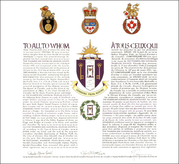 Additional InformationCreator(s)Original concept of Bruce Patterson, Saguenay Herald, assisted by the heralds of the Canadian Heraldic Authority. PainterBarbara Saville CalligrapherHeather Taylor Recipient TypeCivil Institution