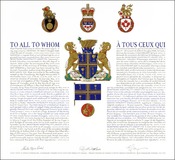 Additional InformationCreator(s)Original concept of Robert D. Watt, Chief Herald of Canada, assisted by the heralds of the Canadian Heraldic Authority. PainterLinda Nicholson CalligrapherDoris Wionzek Recipient TypeCivil Institution |