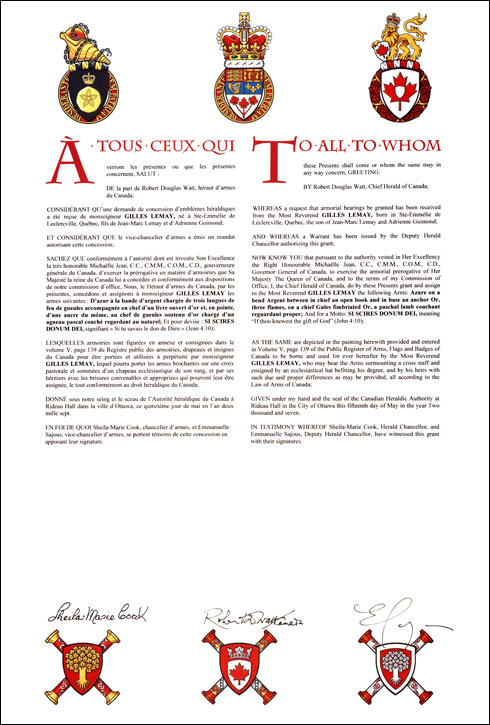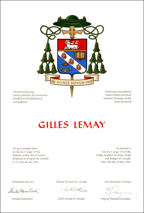 Arms of Gilles LemayBlazonAzure on a bend Argent between in chief an open book and in base an anchor Or, three flames, on a chief Gules fimbriated Or, a paschal lamb couchant reguardant proper; SymbolismIn the chief, red is the colour of love, God’s love for man – a love that is so strong that God sent His only Son to be sacrificed for our redemption. The paschal lamb is the symbol of the resurrected Christ, conqueror of death. In the middle, white is the colour of pure clarity and truth. The band with the tongues of fires symbolizes the Holy Spirit sent to believers by the glorified Christ, who sits at the right hand of the Father. The white band crosses a blue background, evoking the ideas and values that are separate from earthly matters and rise up towards Heaven. The open book represents Holy Scripture, which reveals the Word of God, and the anchor represents eternal life. The book and the anchor, symbols of the path to salvation, are both yellow, a noble colour that represents faith, the most important virtue. |