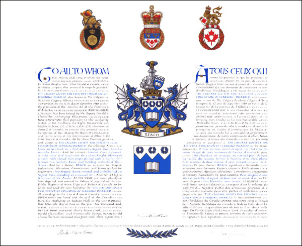 Additional InformationCreator(s)Original concept of Darrel Kennedy, Assiniboine Herald, assisted by the heralds of the Canadian Heraldic Authority. PainterEva Pilar-Cass CalligrapherHeather Taylor Recipient TypeCivil Institution