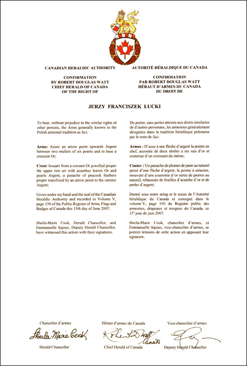 Arms of Jerzy Franciszek LuckiBlazonAzure an arrow point upwards Argent between two mullets of six points and in base a crescent Or; SymbolismThis is the coat of arms generally known in the Polish armorial tradition as Sas, to which Mr. Łucki is entitled by descent. |