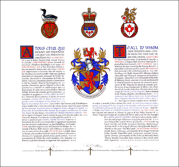 Additional InformationCreator(s)Original concept of Claude Bourret and Auguste Vachon, Saint-Laurent Herald, assisted by the heralds of the Canadian Heraldic Authority. PainterDebra MacGarvie CalligrapherJudith Bainbridge Recipient TypeIndividual |